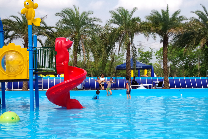 園區內有游泳池、游樂場、摸魚池……